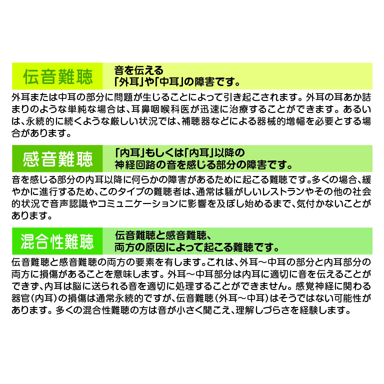 難聴は耳のどの部位が原因になるかによって、大きく2種類に分けられます。ひとつは伝音性難聴といい、もうひとつを感音性難聴といいます。