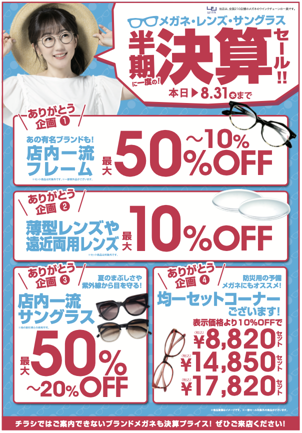 メガネ・補聴器のウインク沼津原町店では、8月31日(水)まで半期に一度の決算セールを開催致します!普段お値引きできない品も期間中対象となります。ぜひ、この機会にご利用ください。