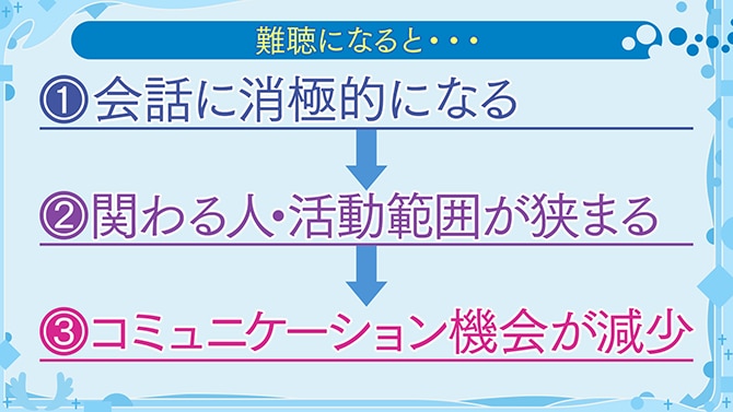 難聴はコミュニケーション頻度の低下につながります。番組でお話しがありましたが、難聴が認知症の要因の1つとして挙げられ、補聴器の装用を推奨していました。