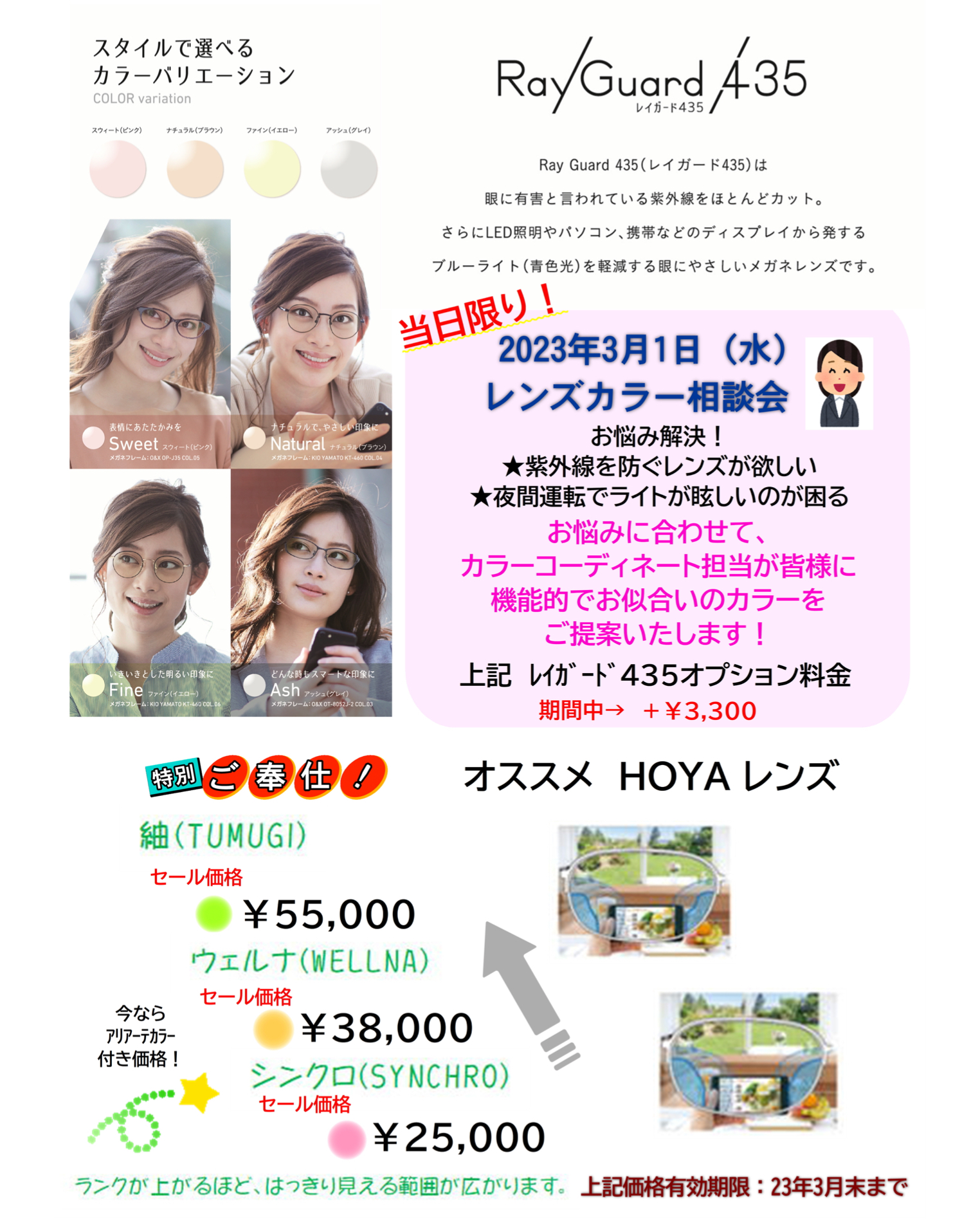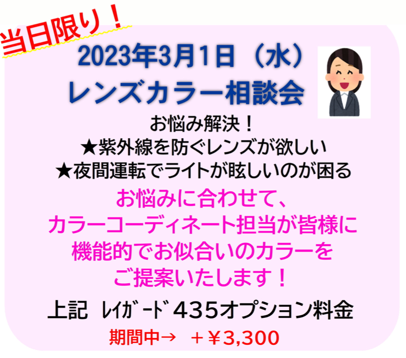 沼津原町店では3/1(水曜)にレンズメーカーHOYAさんによる レンズカラー相談会を開催いたします^^ まぶしさやお顔に合ったレンズの色選び