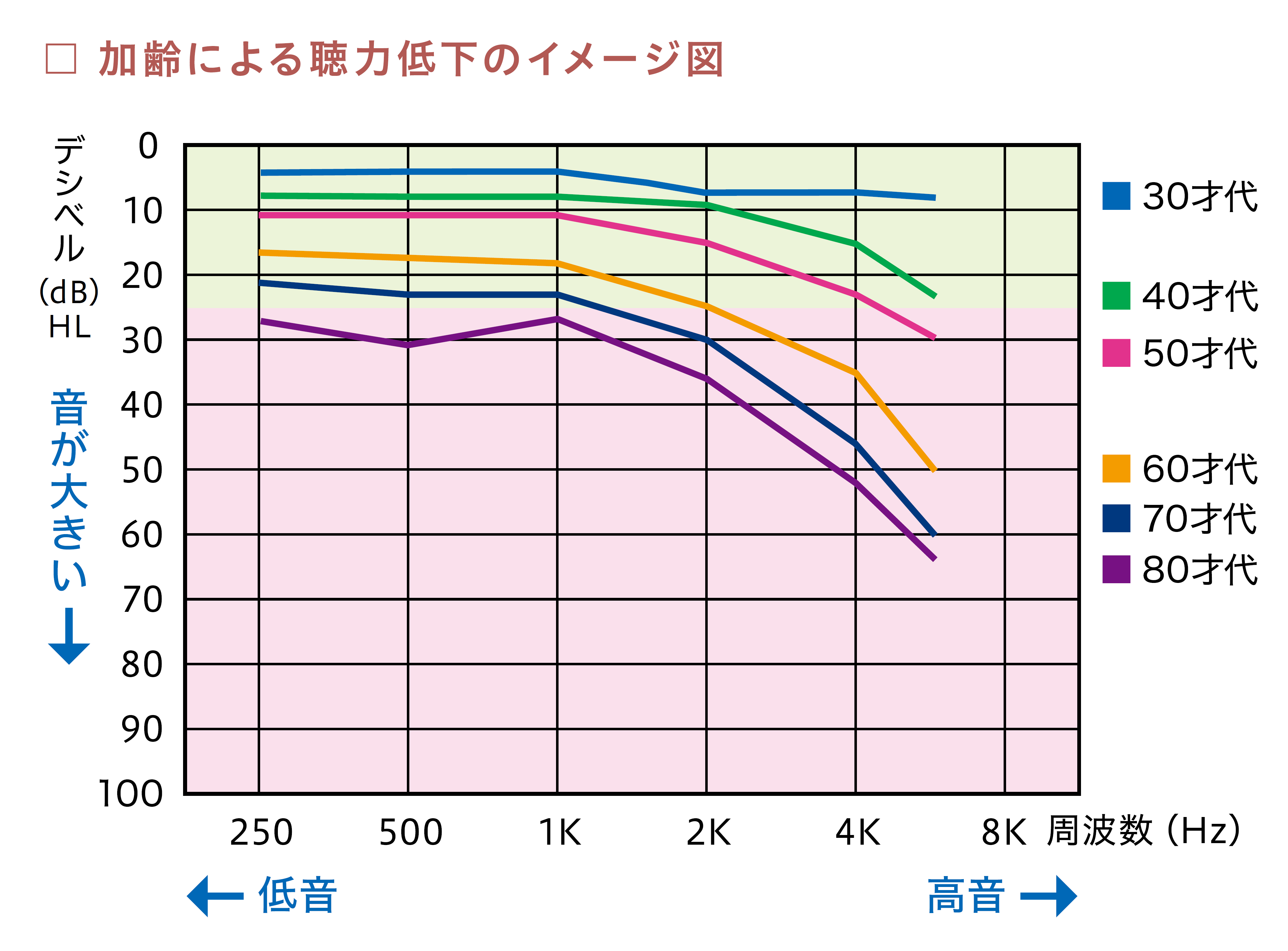 こちらのグラフを見ると年齢を重ねていくにつれて右肩下がりのグラフになって 高い音が自然と聞きづらくなっていくのが分かります。 テレビの音や会