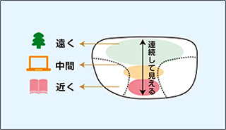 1つのレンズに焦点が多数あるレンズです。「遠近両用レンズ」に代表される、1つのメガネで掛け替えることなく遠くと近くを見ることができるレンズです。