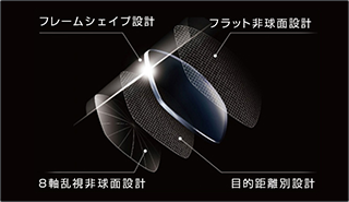 従来からある「球面設計」、ゆがみを減らしレンズの厚みを薄くする「非球面設計」、さらに性能・薄さを向上させた「両面非球面設計」、よりカスタマイズされたオーダーメイド非球面設計があります。