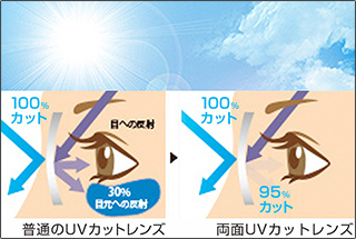さらに紫外線対策を強化したい場合には、レンズ裏面に反射する紫外線をカットするワンランク上のUV対策コーティング<両面UVカットレンズ>があります。