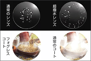 防曇コート加工は、マスクや食事の湯気などによるレンズのくもりを防げます。